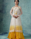An ombre dyed Anarkali cotton slip is topped with an organza jacket that is beautifully embroidered in the front and has an openable front. Fabric: Organza silk & satinEmbroidery details:...