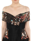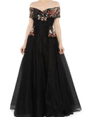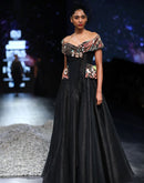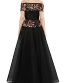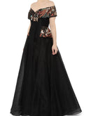 Black sweetheart neckline fit & flare off-shoulder cotton silk gown embroidered floral motifs