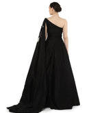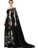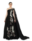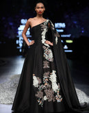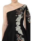 Silk thread & stone floral embroidery one shoulder gown with one elongated sleeves Color: Black Fabric: Cotton silk Care Instructions: Dry Clean Only.