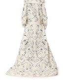 Black silk thread asymmetrical embroidery trail gown with wide sleeves