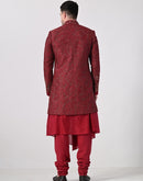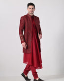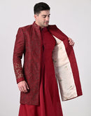 maroon Indo-Western outfit featuring a heavily embroidered sherwani ja