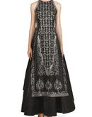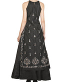 Featuring a black embroidered sleeveless cotton silk kurta paired with a black dupion silk skirt.