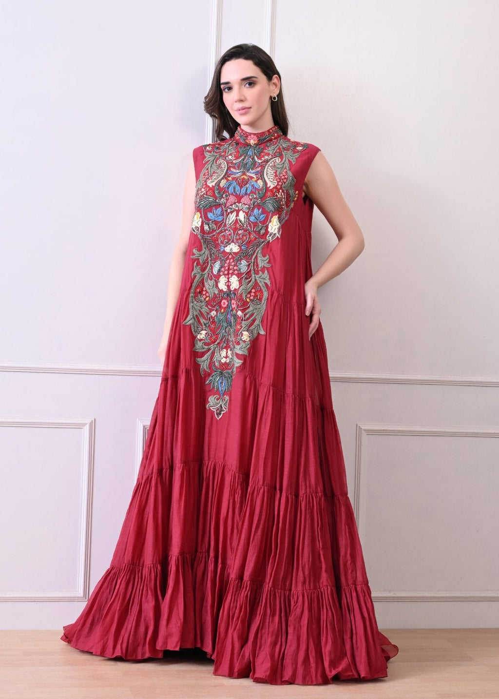 An ode to refined elegance, The Garnet High-Neck Statement Dress is crafted in sheer organza, layered over a soft cotton inner slip for comfort and structure. Its graceful silhouette is elevated with intricate silk thread embro...