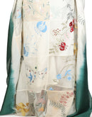 Ivory with green Ombre, floor-length cotton-silk kaftan with open front that is given an array of eye hooks is beautifully embroidered in silk yarns and zardozi The neckline showcases big collars, adding to the fun.