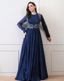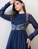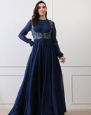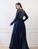 Crafted in luxurious Chanderi and lined with soft cotton, the Rosette Majesty Anarkali showcases intricate floral embroidery on the bodice, rendered in fine silk threads and adorned with opulent zardozi work. The fabric’s natural sheen adds a graceful glow, while the exquisite handwork elevates its regal charm — a perfect blend of heritage artistry
