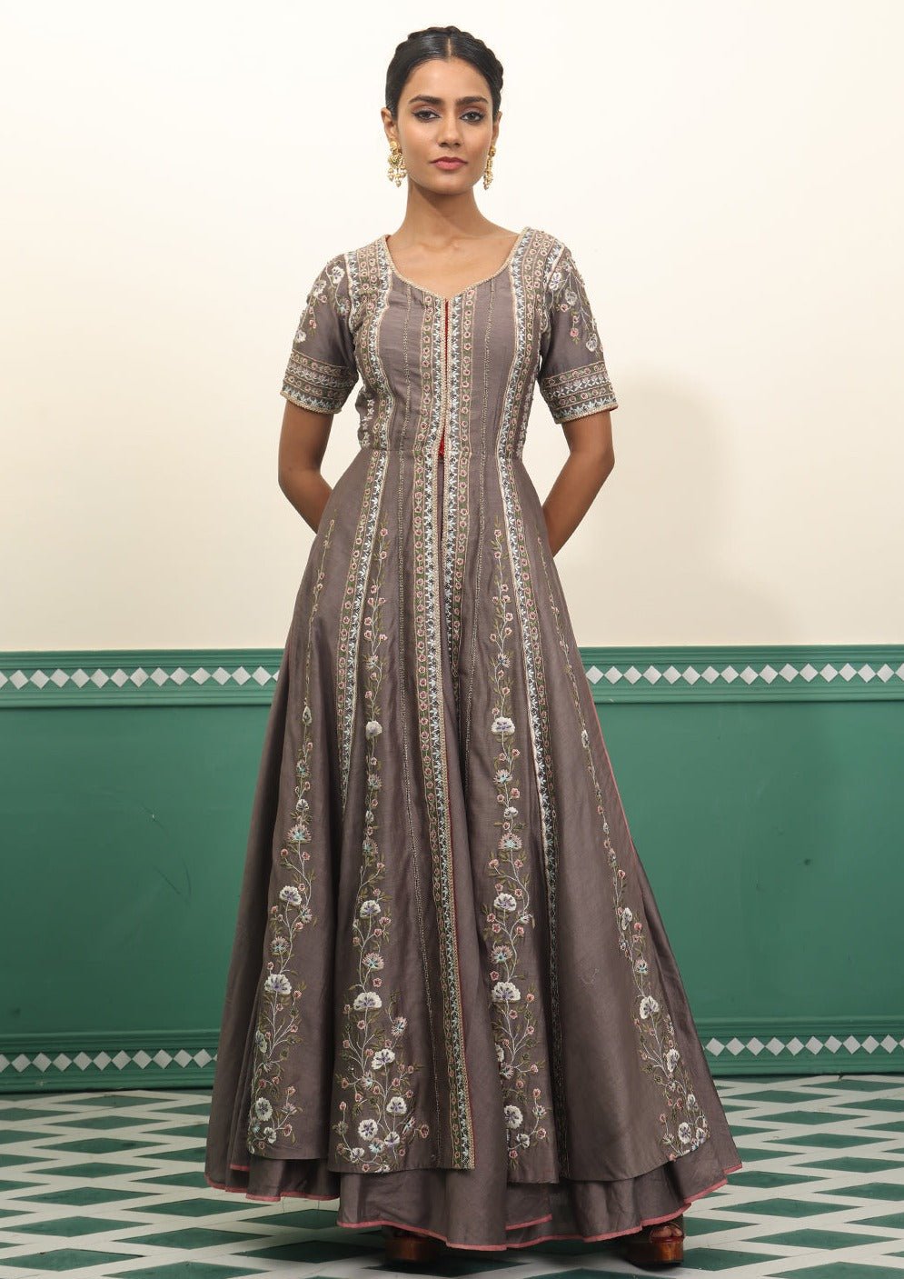 Front open kurta with skirt dress in grey coloured chanderi silk fabric,featuring intricate embroidery with zardozi and silk thread