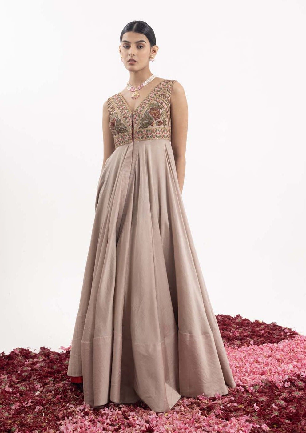 Front-open anarkali in beige cotton silk, adorned with intricate embroidery on both the front and back, featuring a V-neckline.