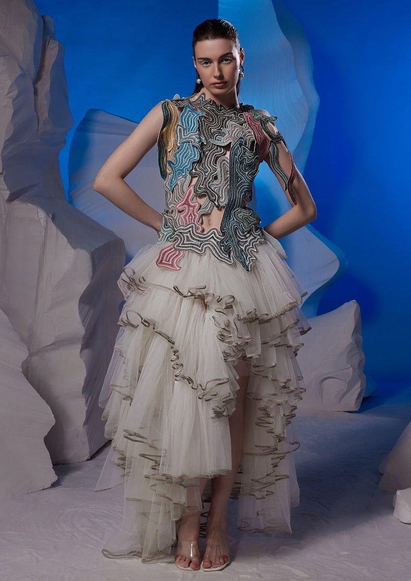 Charming ivory cotton silk dress with a high-low net hem, featuring embroidery with silk thread and Zardozi, along with cut-out embroidery at the yoke.