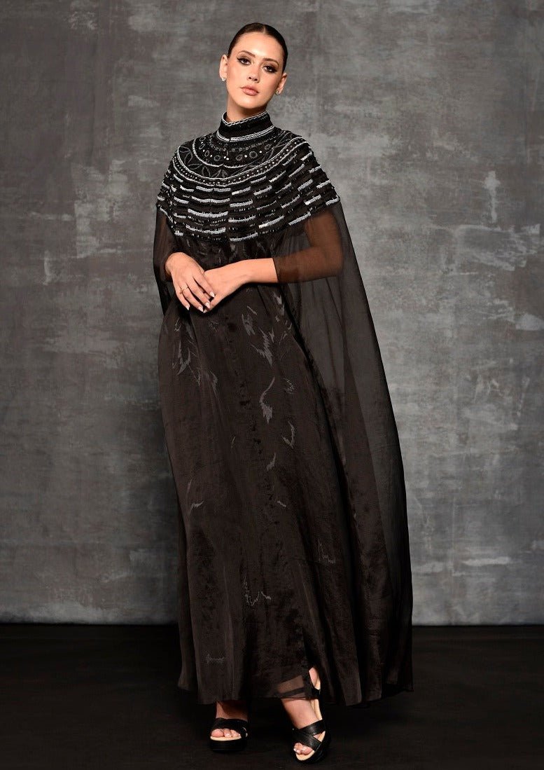Black cotton silk high-neck fitted dress paired with an embroidered high-neck cape, creating a timeless and refined ensemble