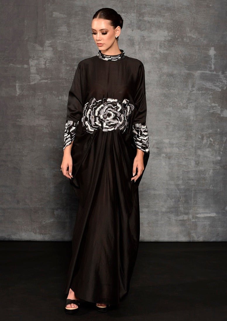 Black cowl dress adorned with vibrant embroidery at the waist, effortlessly combining modern flair with detailing on waist