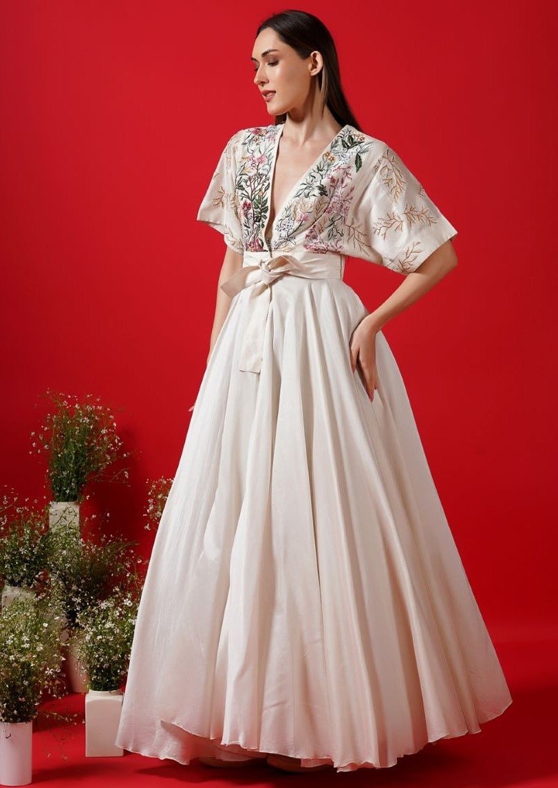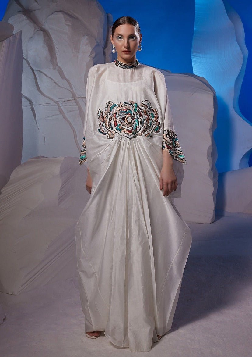 Ivory cowl dress adorned with vibrant embroidery at the waist, effortlessly combining modern flair with colorful detailing.