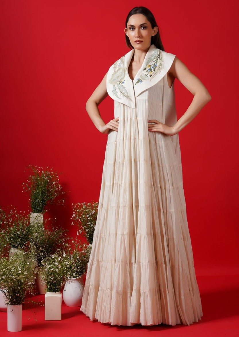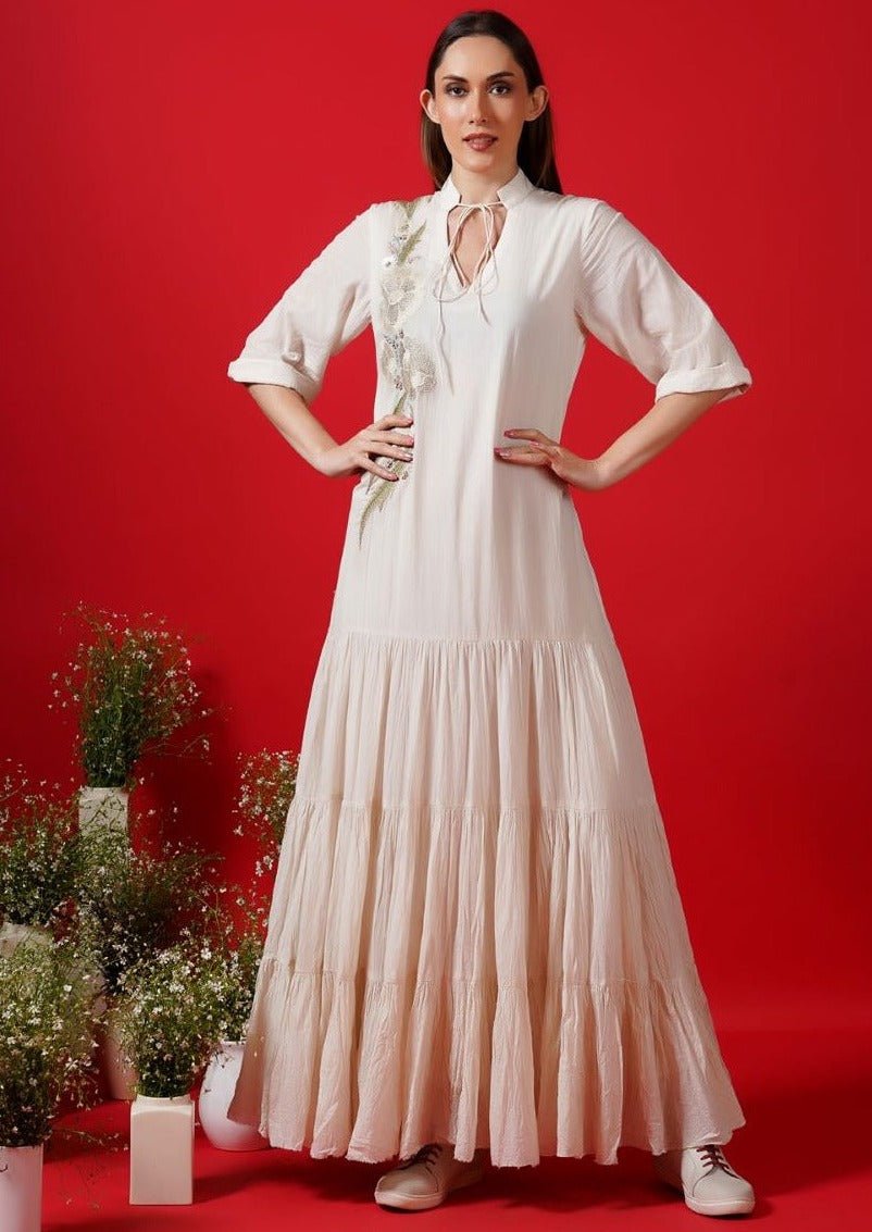 Ivory cotton silk & cotton Kaftan dress floor-length that is embroidered around the neck and has in tier border