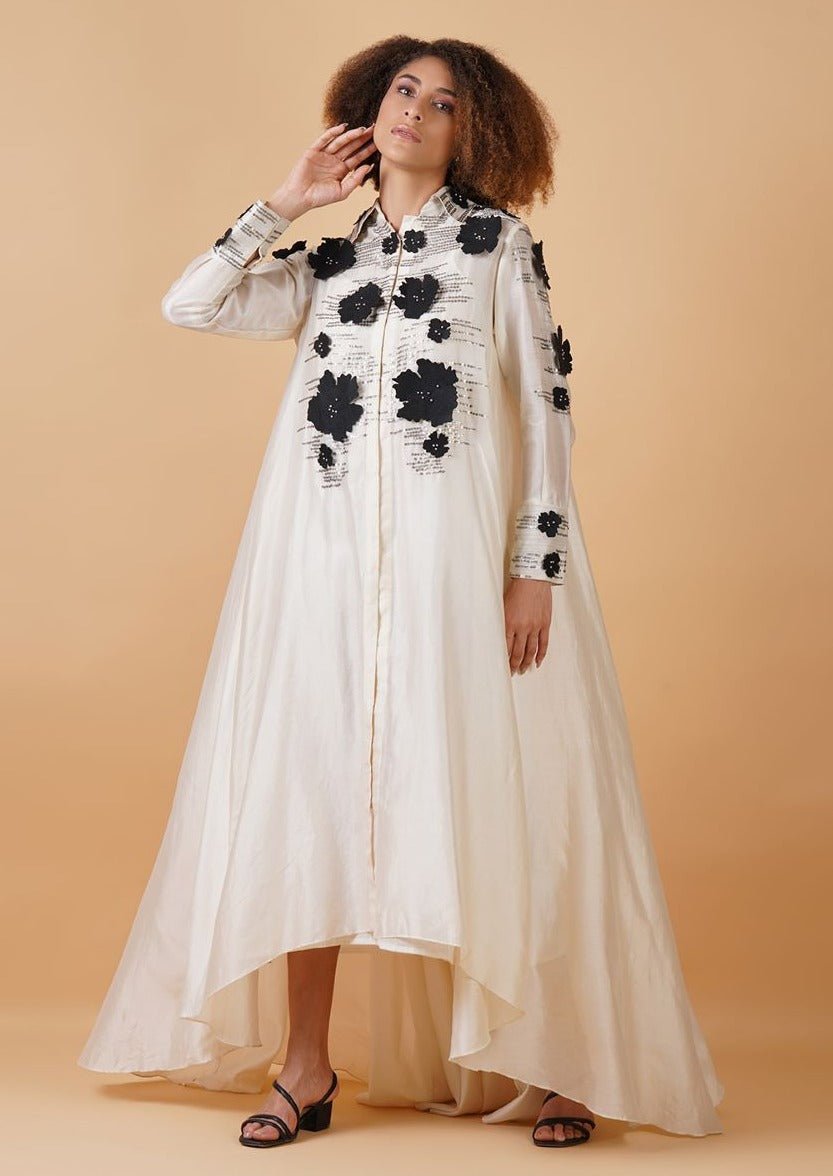 A long cotton silk dress that is adorned with appliqué work in organza and silver yarn embroidery. The broad neck and boxy sleeves add definition to the garment.