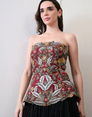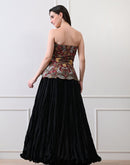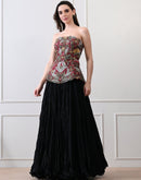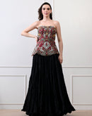 Crafted in lustrous Chanderi with a soft cotton lining, the Merlot Bloom Corset Set pairs a strapless corset with a graceful skirt in rich black and deep maroon tones. The bodice features intricate floral embroidery in fine silk threads, highlighted with opulent zardozi accents. A perfect blend of heritage artistry and modern elegance, it creates a silhouette that is both bold and timeless.