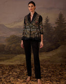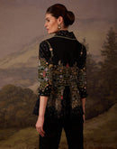 This tailored black jacket features intricate all-over embroidery in gold and jewel tones, inspired by botanical and geometric motifs. Designed with a structured silhouette, along with slim pants