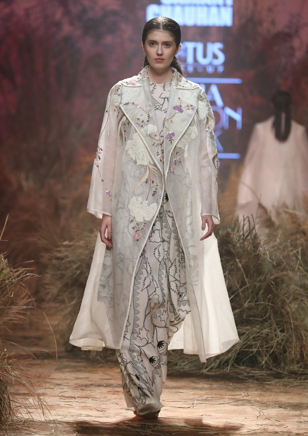 Ivory draped cotton silk dhoti jumpsuit with linen silk long jacket embroidered floral motifs in silk & zari yarn.Color: IvoryFabric: Cotton Silk & Linen SilkCare Instructions: Dry Clean Only.