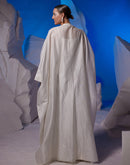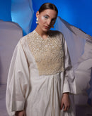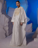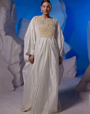Ivory kaftan featuring loaded sequence work at front, adding a touch of opulence to this stylish and versatile ensemble.