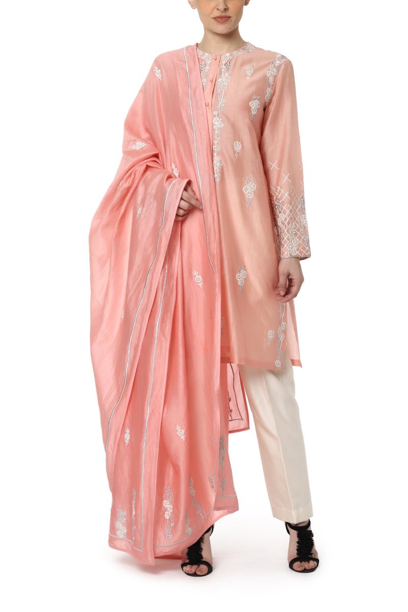 An off white chanderi silk embroidered kurta with two front slits along with cigarette pants and peach organza dupatta
