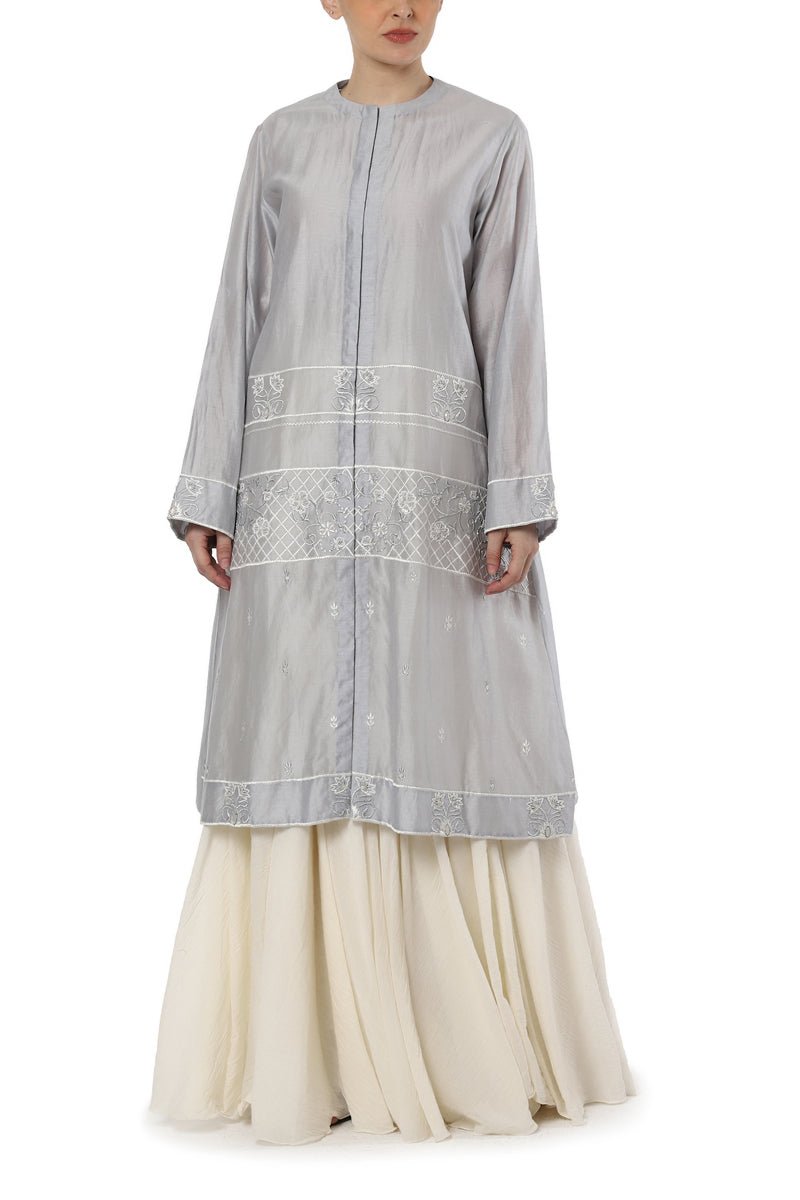 A beautiful layered ensemble with grey A-line cotton dress that is topped with a lovely organza shirt, intricately embroidered in off-white silk yarn.