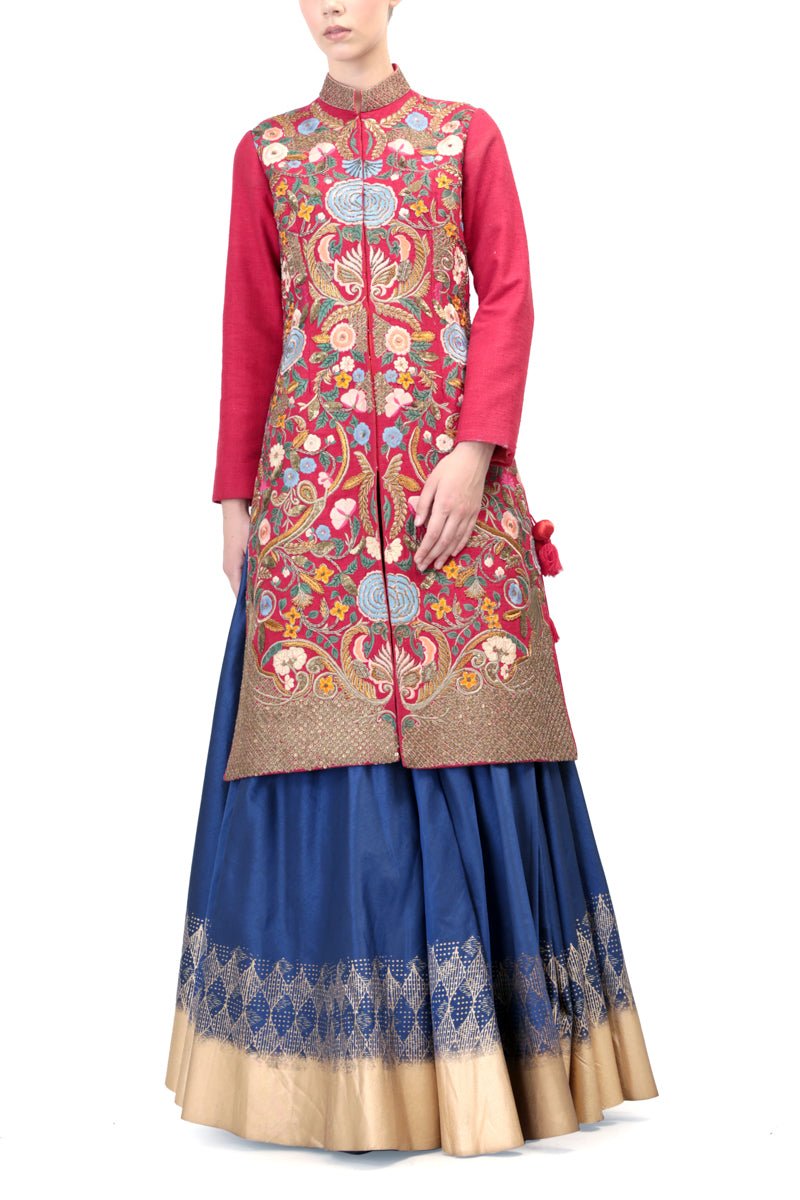 Featuring a red embroidered kurta with a blue block printed lehenga.Color: Red & BlueFabric: Handloom & Dupion SilkCare Instructions: Dry Clean Only.