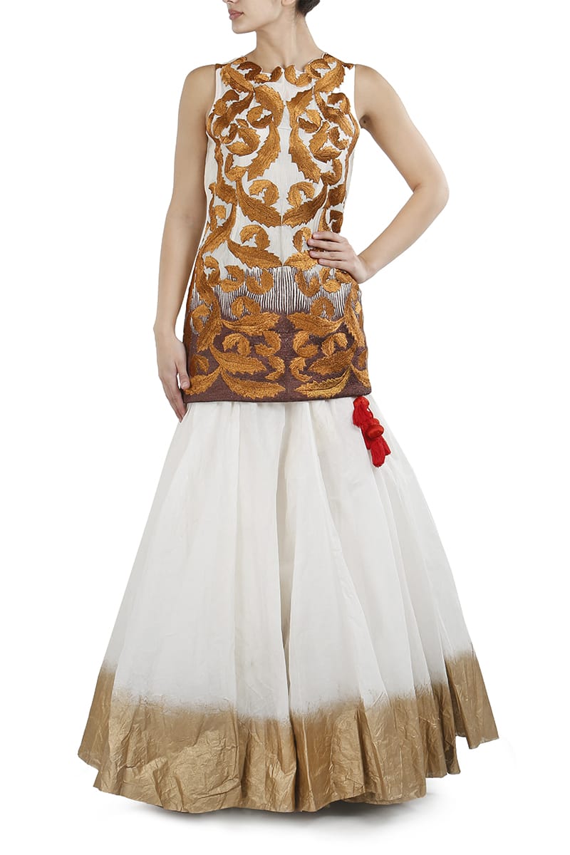Golden Zari embroidered white Cotton Silk short Kurta paired with a foil printed white Lehenga.