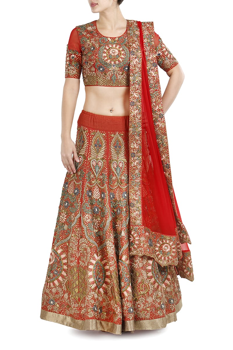 Scarlet red Cotton Silk Lehenga set embroidered in zari work paired with a net dupatta detailed with zari embroidery.