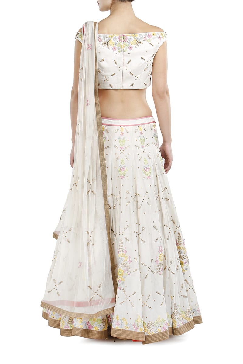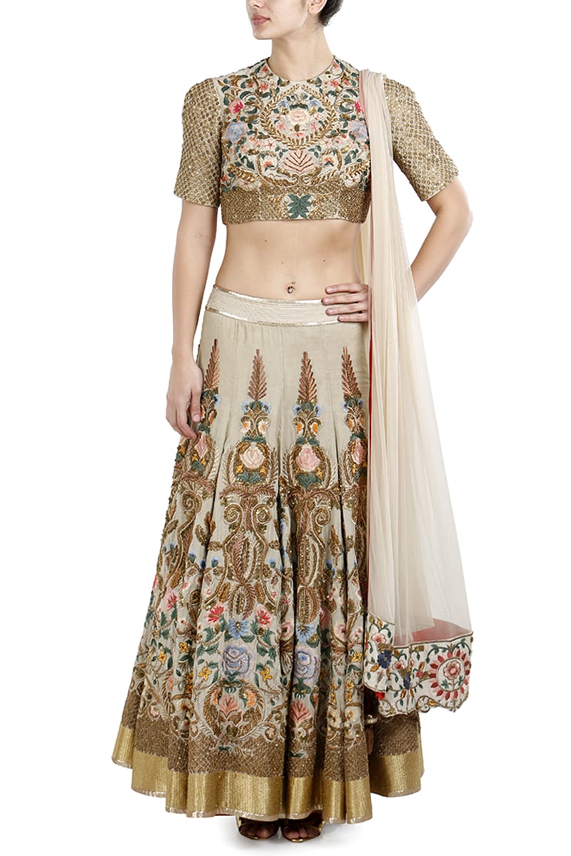 Golden Zari embroidered ivory Lehenga paired with embroidered Cotton Silk fitted blouse & ivory soft mesh dupatta highlighted with silk yarn, sequins & zari embroidery.