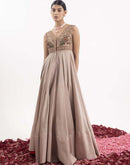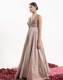 Front-open anarkali in beige cotton silk, adorned with intricate embroidery on both the front and back, featuring a V-neckline. Fabric: Cotton Silk Embroidery details: Zardozi embroidery Set of: 1 Colour:...