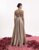 Front-open anarkali in beige cotton silk, adorned with intricate embroidery on both the front and back, featuring a V-neckline.