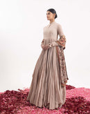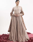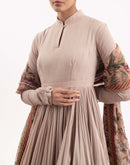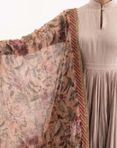 Anarkali set in beige cotton silk, paired with a printed dupatta for a stylish and coordinated ensemble.