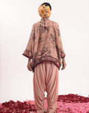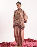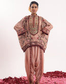 Peach cotton silk, featuring an embroidered and printed kaftan paired with a draped dhoti for a stylish and contemporary ensemble.