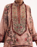 Peach cotton silk, featuring an embroidered and printed kaftan paired with a draped dhoti for a stylish and contemporary ensemble. Fabric: Cotton Silk  Embroidery details: Zardozi embroidery Set of: 2...