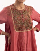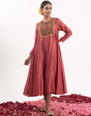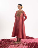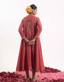 One-piece kalidaar set in dark coral cotton silk, featuring front-neck embroidery and detailed back embellishments.