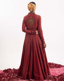 Exquisite one-piece anarkali dress in wine-colored cotton silk fabric, featuring intricate embroidery on the back and detailed neck embellishments