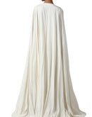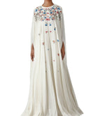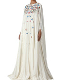 Ivory floor-length cotton silk kaftan with colorful silk yarn embroidery.