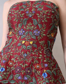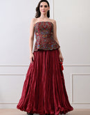 Crafted in lustrous Chanderi with a soft cotton lining, the Merlot Bloom Corset Set pairs a strapless corset with a graceful skirt in rich black and deep maroon tones. The bodice features intricate floral embroidery in fine silk threads, highlighted with opulent zardozi accents. A perfect blend of heritage artistry and modern elegance, it creates a silhouette that is both bold and timeless.