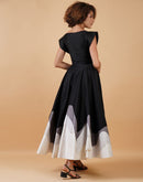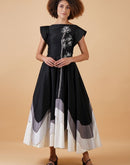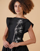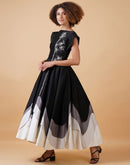 A black cotton silk, A-line dress that is given texture at the bottom. The extended cap sleeves and an embroidery patch of silver zari add beauty to the dress.