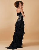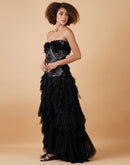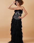 A black tube dress, adorned with beautiful zari thread embroidery and 3D flowers. Adding to the grace is the asymmetric ruffle at the bottom.