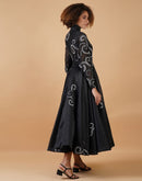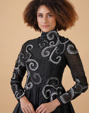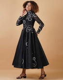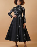A chique A-line black cotton silk dress with a high neck and full sleeves, showcasing beautiful zari embroidery. Fabric: cotton silk  Embroidery details: Zardosi work embroidery Set of: 1 Colour:...