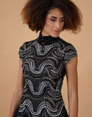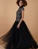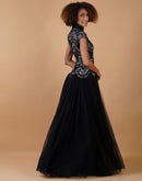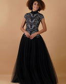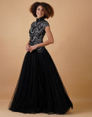 A-line, high-neck gown in cotton silk & net at the top that is intricately embroidered in silver zari and yarn and black net on the skirt.