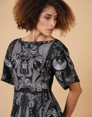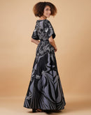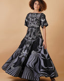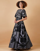 A long cotton silk dress that is adorned with appliqué work in organza and silver yarn embroidery. The broad neck and boxy sleeves add definition to the garment.