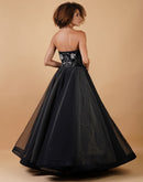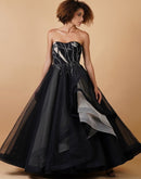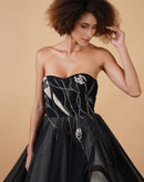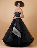 Featured here is a black princess cotton silk and net gown that accentuates the bosom and defines the waistline. The voluminous skirt of the gown showcases asymmetric net ruffle.