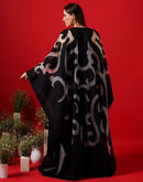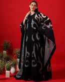 Translucent black Organza silk kaftan that is surfaced with applique work and is paired with a cotton silk slip inside. It has an openable front.