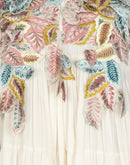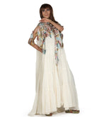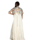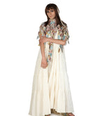 Ivory floor-length cotton tier dress with a splurging high neckline with beautiful 3-D Applique work on the neck and shoulders that dissipates downwards.