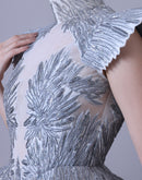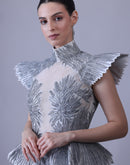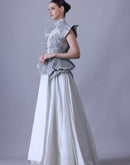 Discover this captivating white gown featuring an intricately embellished silver bodice with a structured neckline and shoulder details