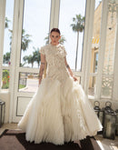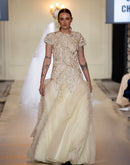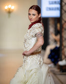 This exquisite gown features a sculpted bodice with ornate bead and thread embroidery, paired with a voluminous pleated skirt in a soft ivory tone