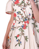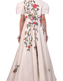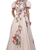 Ivory overlap lapel, puff-sleeved, fit & flare paneled cotton silk jacket style gown embroidered floral motifs of silk & zari yarn.