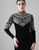A sleek fitted velvet dress adorned with ornate hand-embroidered yoke detailing, bringing together regal craftsmanship and contemporary silhouette for an elevated evening look.