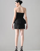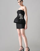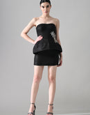 A strapless cotton silk mini dress tailored in a sculpted silhouette, featuring a softly flared peplum layer and delicate hand-embroidered crystal embellishment that adds a refined accent to its minimalist structure.