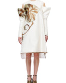 Featuring an ivory cut-out sleeves floral motif embroidered cotton silk dress.